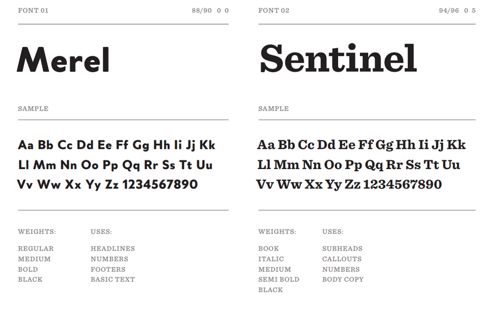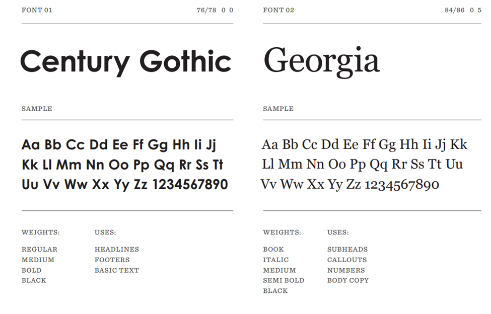 Merel and Sentinel should be used whenever possible. However, if Merel and Sentinel are unavailable due to licensing limits or platform constraints, Century Gothic and Georgia may be used as alternates.