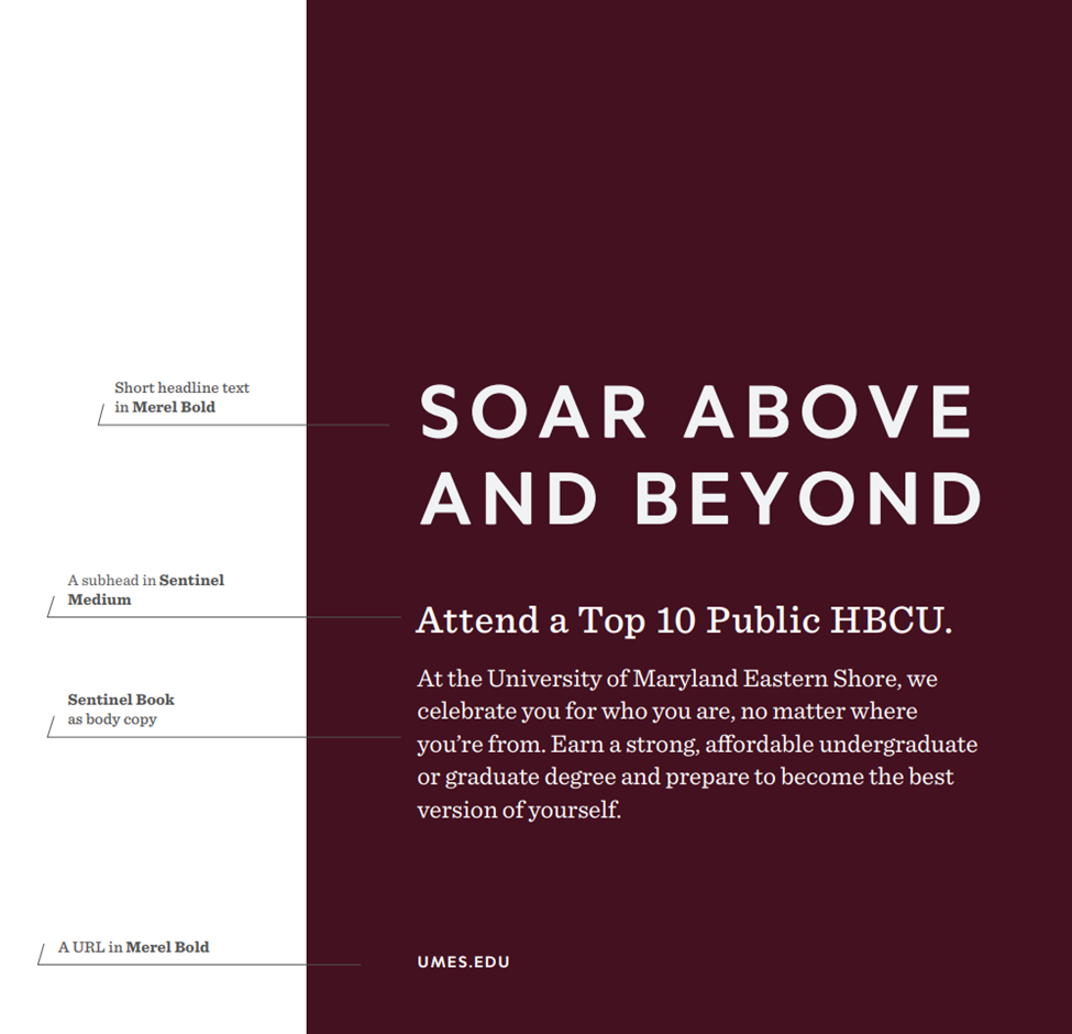 Here, you’ll find examples of how we style UMES brand fonts in action. Merel is used for headlines and can be set in title case or all caps—mirroring the style of our logo. Sentinel is used for subheads and body copy, offering a grounded and cohesive feel across the system. Merel also appears more selectively for callouts, such as URLs. These typographic treatments— from headlines to body text—enhance clarity and reflect our unique identity. Consistent typography helps ensure every piece of communication feels unmistakably UMES.