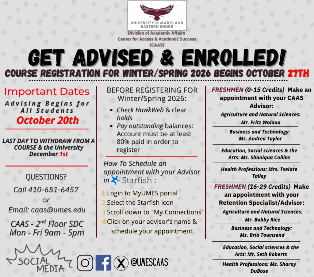 CAAS Advisors work, in collaboration with Retention Specialists, with students who have 29 credit hours or less to enroll in classes for upcoming semesters, track their academic progress and keep them connected to valuable campus resources that will support their academic success.